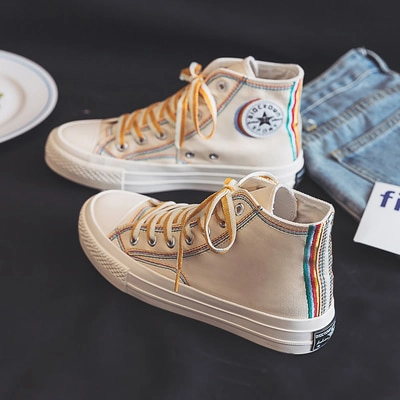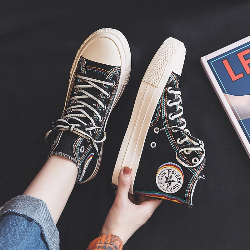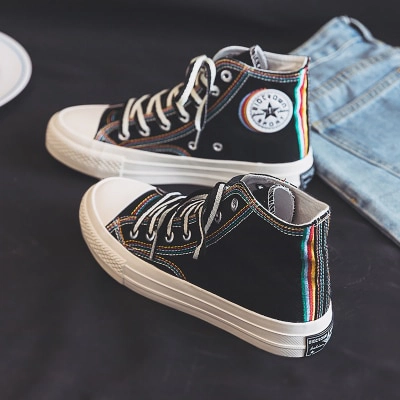Avec leur toile de couleur sobre et leurs fines broderies arc-en-ciel, ces baskets sont le compromis parfait entre originalité et classicisme. Noir ou beige, elles apporteront une touche de couleur bienvenue dans votre dressing et vos journées !