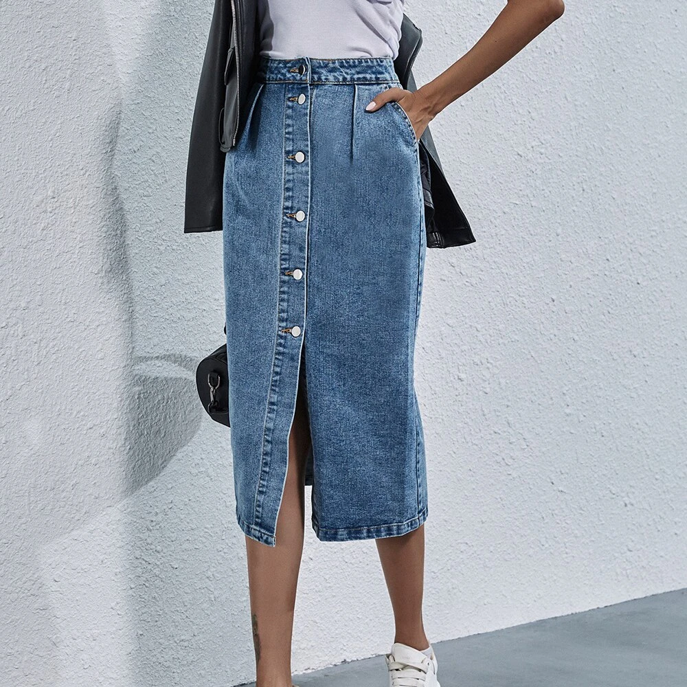 Cette jupe midi vintage en denim bleu ! Elle est fabriquée en denim vintage, ce qui lui confère un look unique et élégant, et elle possède également des poches pour plus de fonctionnalité. De plus, son design simple et élégant vous permet de l’habiller facilement.