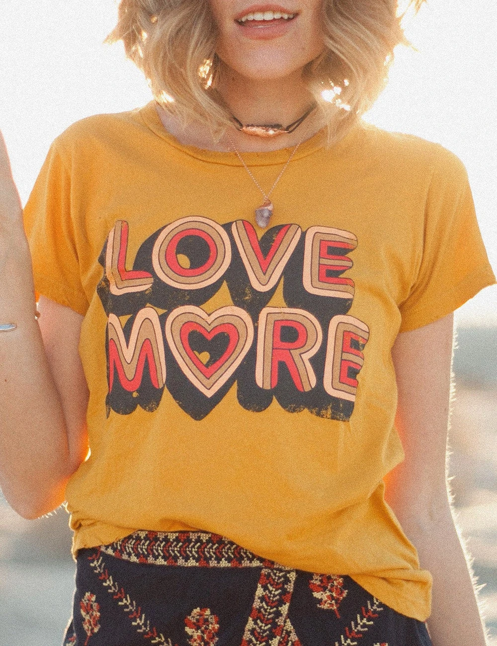 Ce t-shirt vintage pour femme est conçu avec un tissu en coton ultra doux et respirant qui offre un confort supérieur et une durabilité à long terme. Sa coupe relaxée, ses manches courtes et sa couleur jaune lumineux se marient parfaitement à n’importe quel look chic ou décontracté. Le message «Love More» peint en lettres orange et rouge souligne la beauté intemporelle de ce design unique.