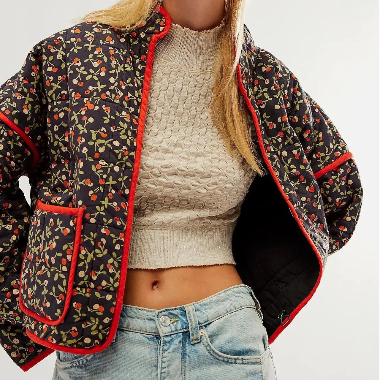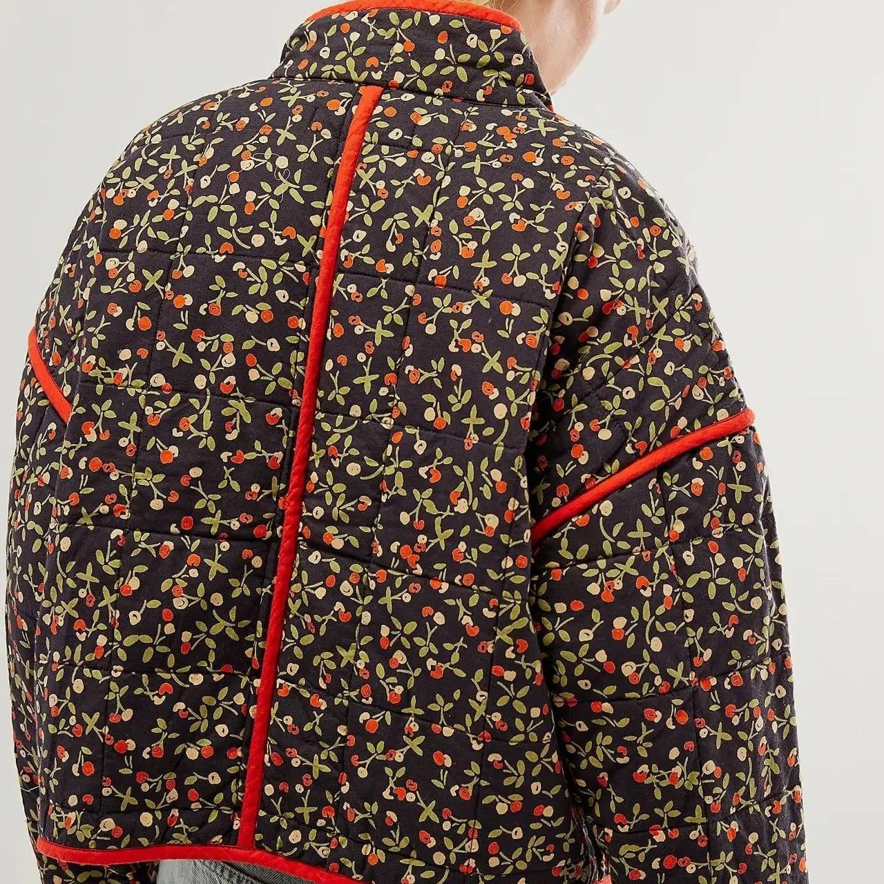 Notre veste matelassée noire reprend tous les symboles des années 70 pour un style vintage mais modernisé. Arborant des motifs de petites fleurs rouges, cette pièce apporte une touche bucolique et bohème à votre garde-robe.